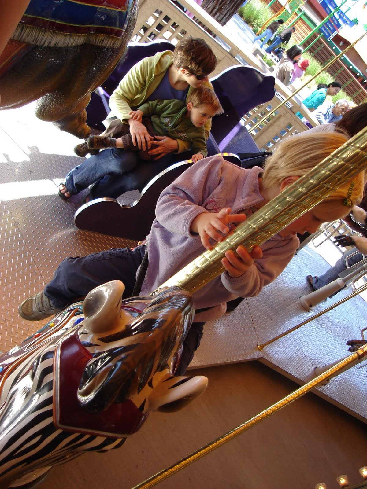 Above: Maddy loves the merry-go-round! Milo talks a big game alright -- pretty much every day he says, "I go ride tiger. I go ride tiger. I want merry-go-round!" But when we go to the park, he chickens out and sits on the bench with Mom or Dad. It's pretty amazing that the little guy will jump from ridiculous heights, loves to rough house, and especially likes me toss him in the air as high as possible. Yet, the fake tiger on the merry-go-round and his "Very Clever Crocodile" Pop-up book both scare him (though he still asks for them both every day). Fair enough.